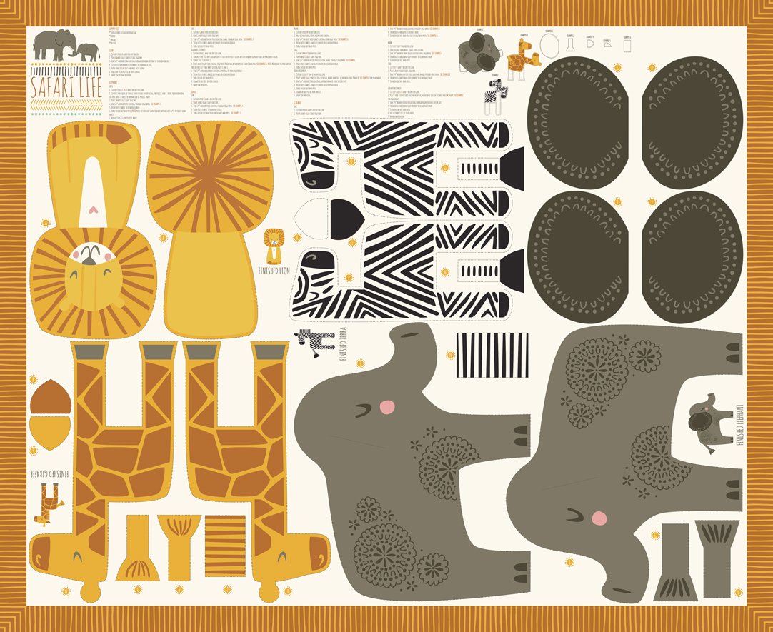 The Safari Life Animal Panel is designed by Stacy Iest Hsu for Moda fabrics. One panel will make 4 fun animals.....Lion, Zebra, Elephant and Giraffe. Panel is 36" x 44".
